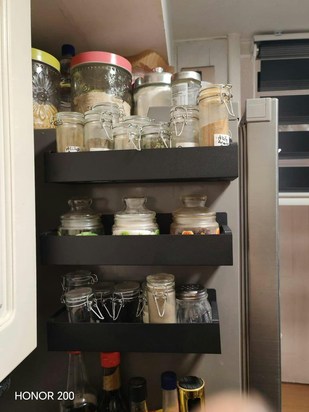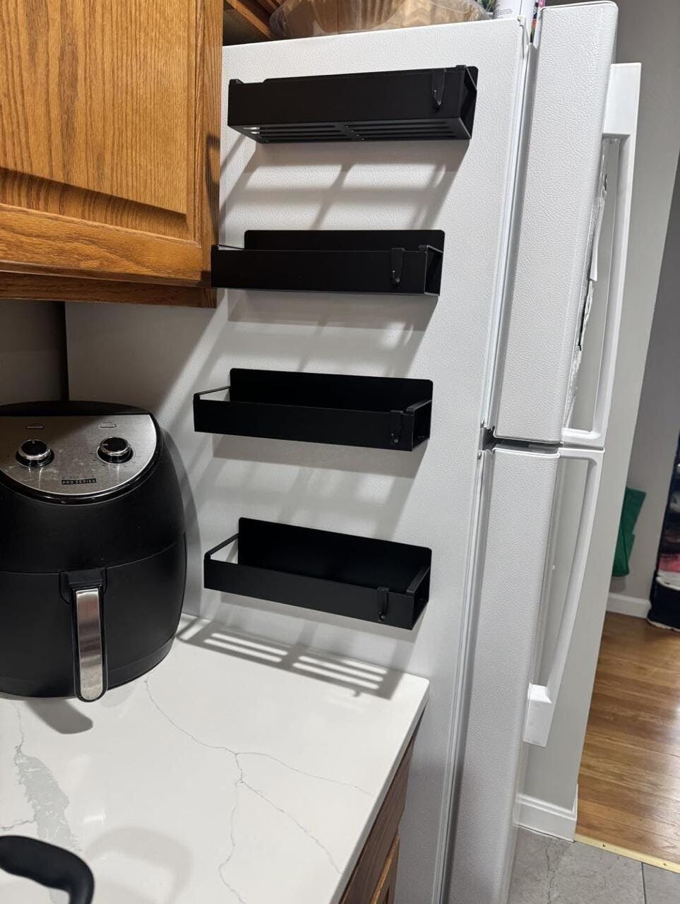 Especiero Magnético De Alta Calidad: El especiero magnético para el refrigerador está hecho de acero al carbono espesado de alta resistencia, grueso y no deformado. El acabado negro mate, que es una superficie pintada, es impermeable, resistente al óxido, resistente y hermoso. El especiero magnético es definitivamente un increíble ahorro de espacio, libera espacio en el gabinete de su cocina o en la encimera y mantiene su cocina organizada y ordenada.
